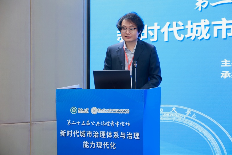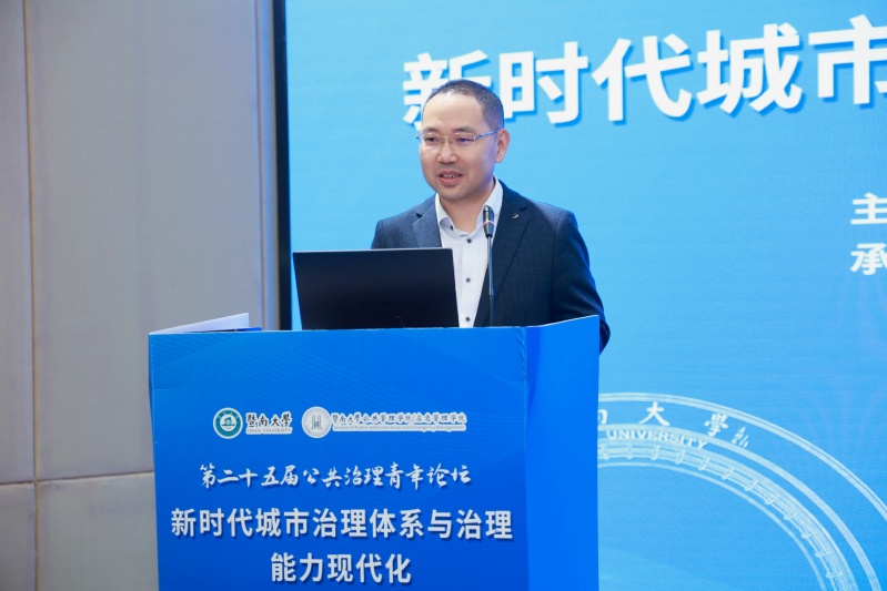 杨杰在致辞中介绍了暨南大学作为“华侨最高学府”的悠久历史与办学特色,以及近年来在人文社会科学领域取得的成效,充分肯定了公共管理学院/应急管理学院在学科建设、科学研究等方面的新成绩。他指出,本次论坛聚焦新时代城市治理体系与治理能力现代化主题,在国家深入推进粤港澳大湾区建设、推动城市高质量发展的关键时期,具有重要的理论意义与实践价值,期待与会专家学者深入交流,共同为推动中国式现代化贡献学术智慧与理论力量。
