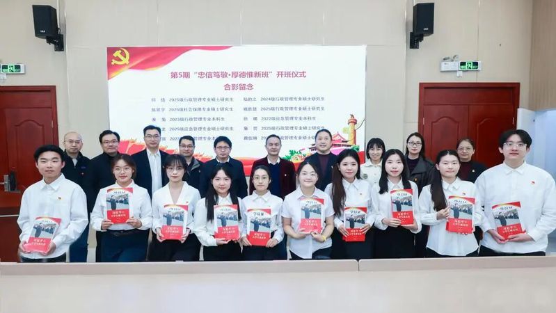 2025级行政管理专业硕士研究生詹赟代表第5期“忠信笃敬·厚德惟新班”全体学员庄严承诺:以“厚德”正心,筑牢信仰之基,深学细悟党的创新理论,永葆党员本色,以“忠信笃敬”砥砺品格,夯实立身之本;以“惟新”促学,提升干事之能,珍惜学习机会,勇于探索前沿理论,积极参与社会实践,在知行合一中练就过硬本领;以“善治”立志,担当时代之责,立足公共管理学科特色,将论文写在祖国大地上,在服务国家治理体系和治理能力现代化的实践中,展现青春作为、贡献青春智慧。