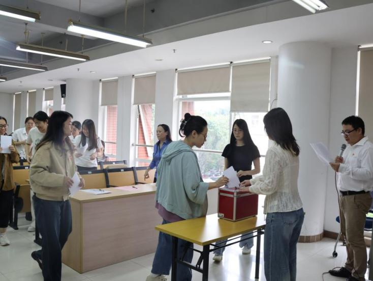 监票人检查票箱后,由计票人向有选举权的正式党员分发选票。正式党员认真填写选票,有序投下庄严的一票。
