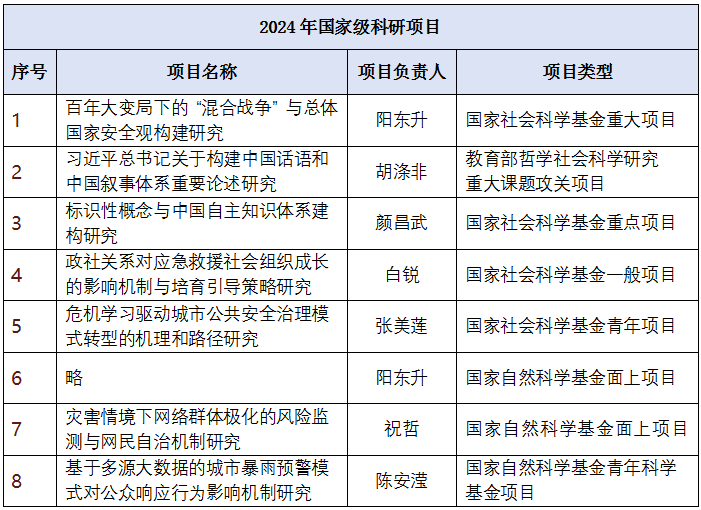 上述项目立项是我院实施以公共管理为基础,以应急管理为特色,公共管理与应急管理融合发展学科发展战略取得的重要成果。祝贺各位获批基金立项的老师们。让我们再接再厉,为推进学院科学研究高质量发展共同努力,不断擦亮暨南大学百年侨校“金字招牌”。